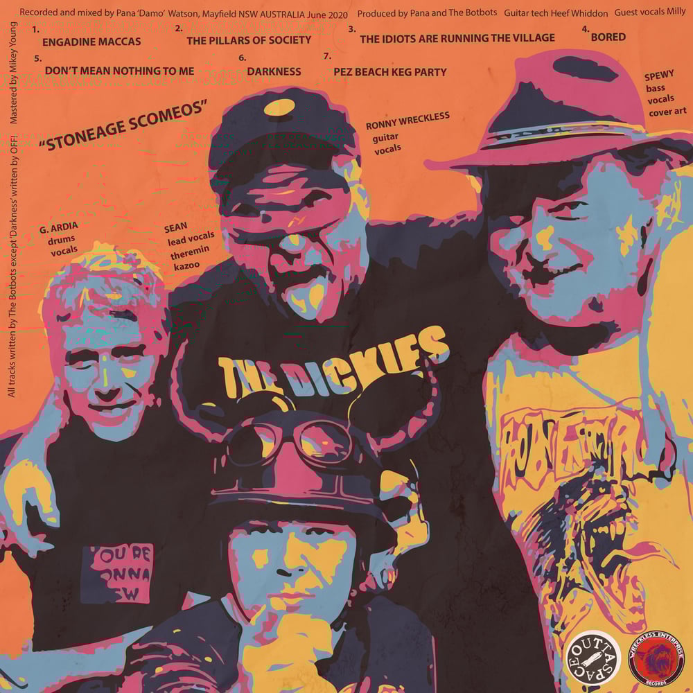 THE entire concept was suss – songwriting over the ether, one gig and a fairy’s snatch of rehearsals. Perfect time to rock up to a studio in Mayfield, NSW, to record seven punk songs. THE BOTBOTS’ first and only show was in Mayfield in late February 2020, and the plug was pulled due to onstage swearing, and sports being on the TV. Four months later, the pack returned to eat their own sick and record STONEAGE SCOMEOS with Pana Damo Watson, who we will meet a bit later.